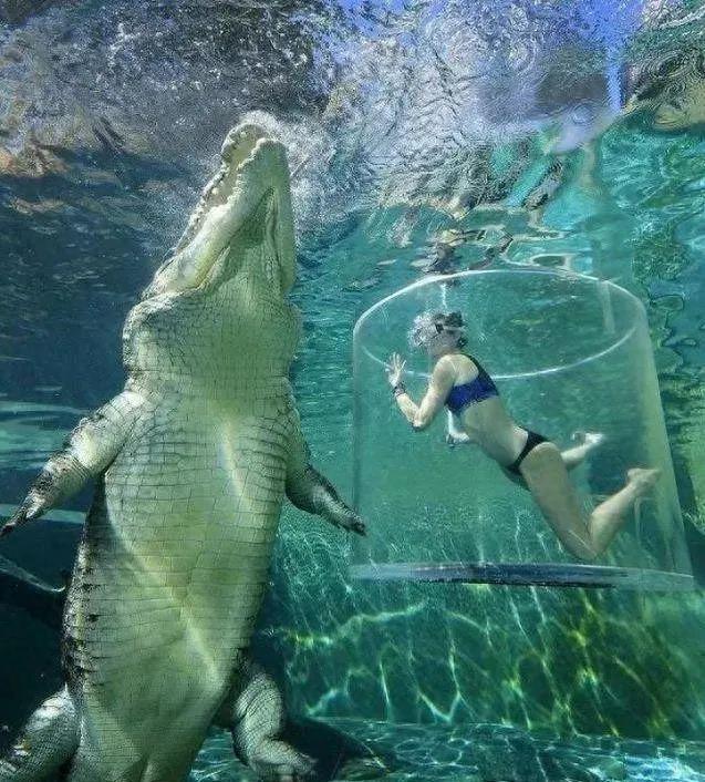 38. 生活在湿地的咸水鳄鱼是世界上现存最大的爬行动物之一。他的身材与周围的美女形成了鲜明的对比。