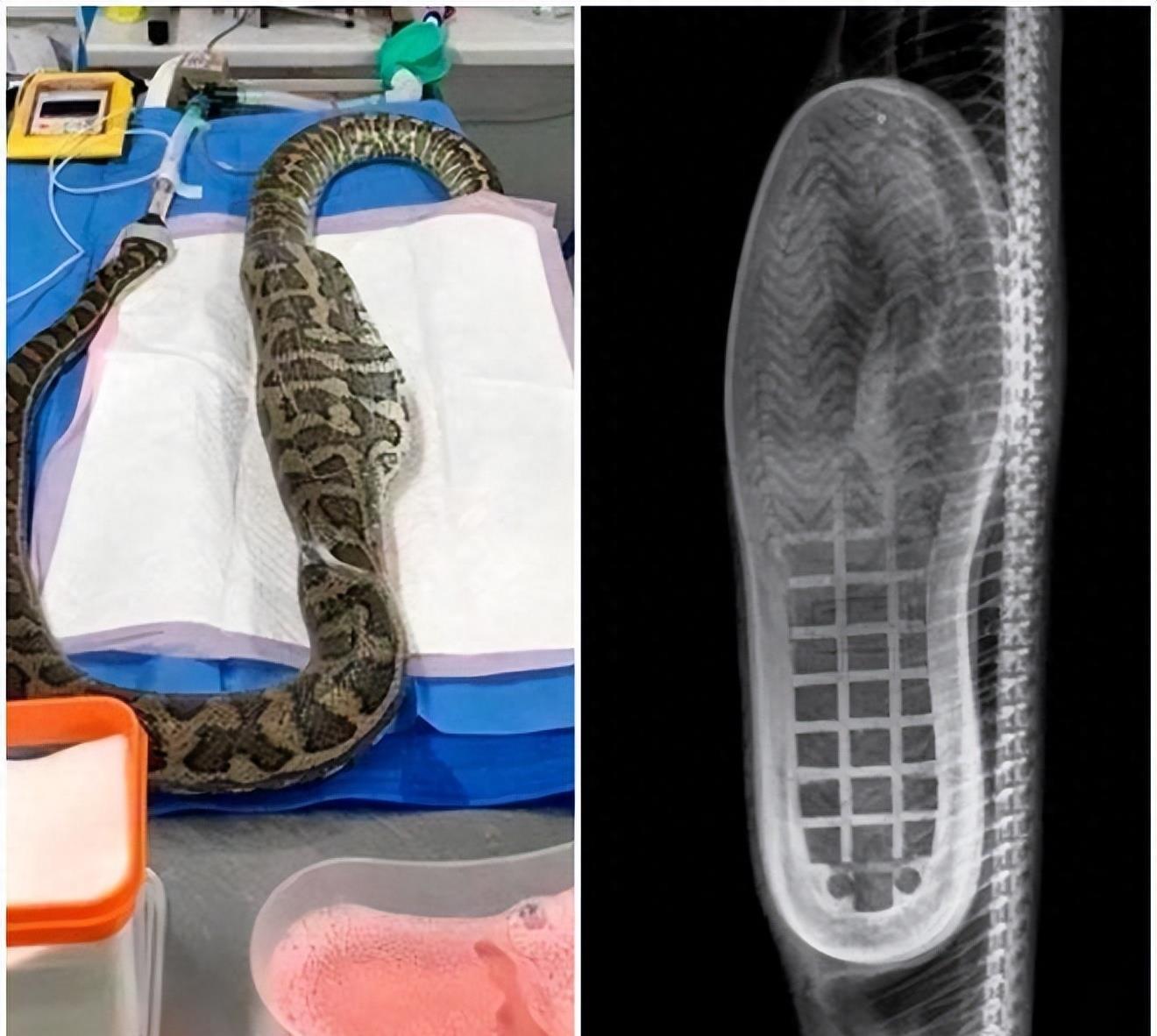 19. 这条愚蠢的蟒蛇不知为何吞下了整只鞋子。如果不是医生救了他,他可能就死了。