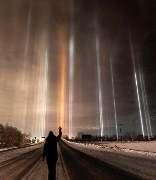 23. 美丽的“加拿大光柱”是在极冷的条件下冰晶悬挂在空气中形成的。然后冰晶与周围所有光源发生反应,创造出这个令人惊叹的场景。