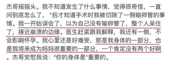 因为患者需要打麻醉才能接受动手术,而谢娜被打麻醉药之后,医生却发现她的一侧输卵管炎症比较严重,医生赶忙和张杰商量,让他马上做决定。 可他从未经历过这些事,虽然有些慌张,但他认真地听从医生的分析和建议后,同意了切除一侧输卵管的手术。