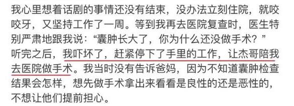 可因为手头上还有工作没完成,话剧还在排练中,谢娜又坚持着工作了一周。工作结束后去医院复查,结果被医生痛斥一顿:"囊肿长大了,你为什么还没做手术?" 吓坏了的她这才停下工作,接受医生的建议。