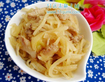 葛薯从一头开始剥,慢慢把皮去掉,然后切成薄片,再切成细丝,瘦肉也切成丝。锅中热油把瘦肉放入翻炒,加入少许葱花,滴入适量生抽,把切丝的葛薯放入翻炒,炒软后加入适量盐,加入适量蒜米放入,淋入适量生抽搅拌均匀即可。