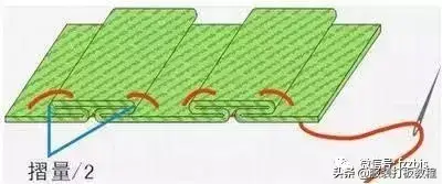 方法四:用软尺量需要装饰荷叶边边缘长度,然后加上荷叶边所需要量,得到荷叶边总长,宽根据需要自定,裁好布料,将布另一边做折边缝或用机器锁好边。用针线将布边一边按摺量折好一边缝,待用。用大线迹缝好后把线抽紧至所需长度打结固定既可,把做好荷叶边与布料正面相对缝合既可。