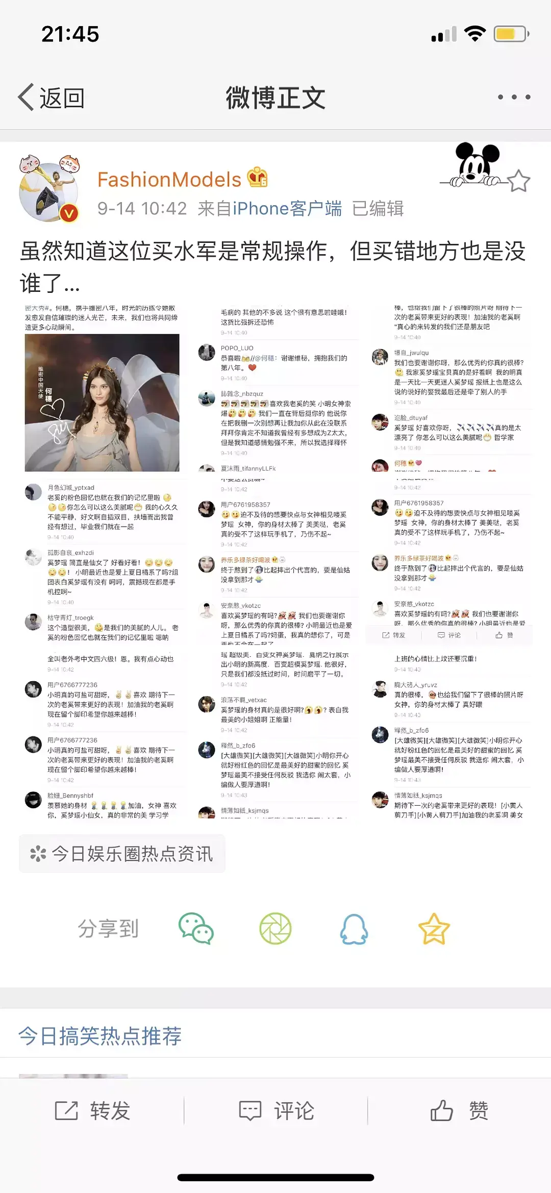 微博转评就有买的 16年时候买的还是便宜的水军哈哈哈哈哈只是单纯夸赞的转发,到了18年有野心买带名字跟热度,转发了结果买错了。可以说是很苦逼了,附上网友扒出的买水军石锤。这波你怎么看呢?
