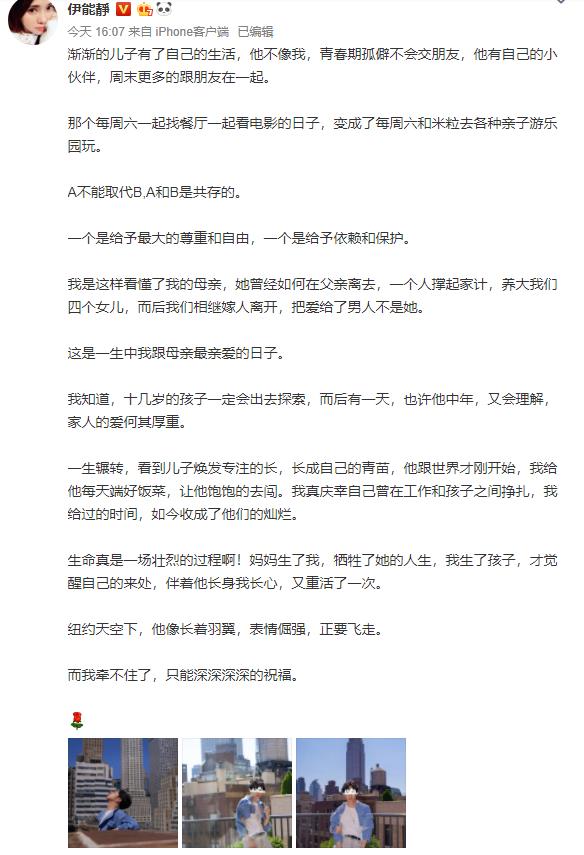 今天(9月1日)下午,伊能静写下一篇400多字的文章讲述了有关儿子的故事。还罕见的首次上传了17岁儿子的三张照片。