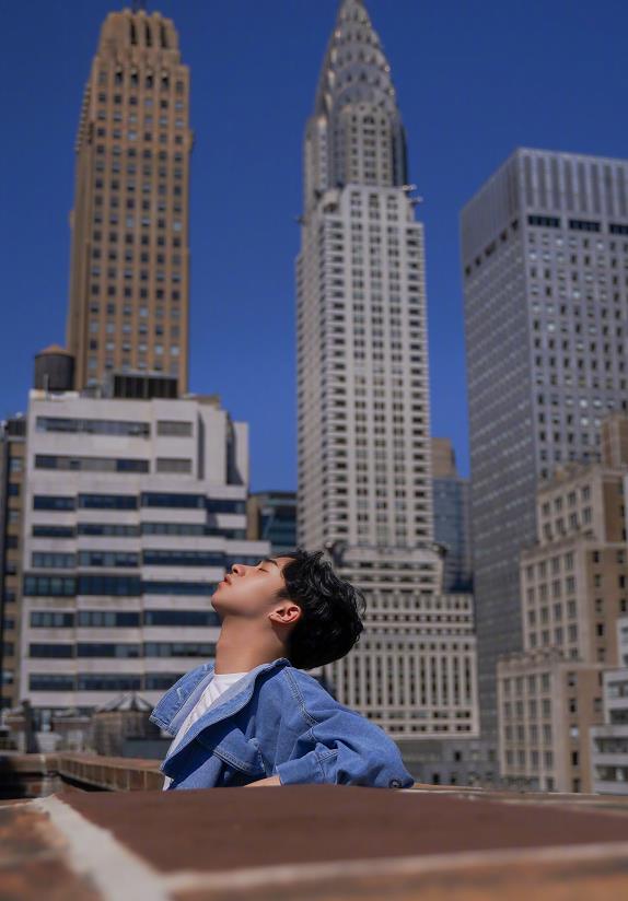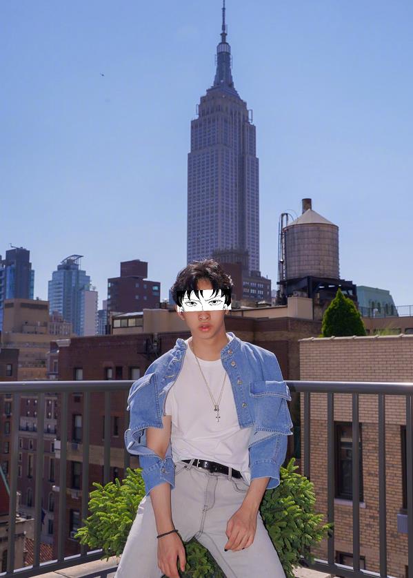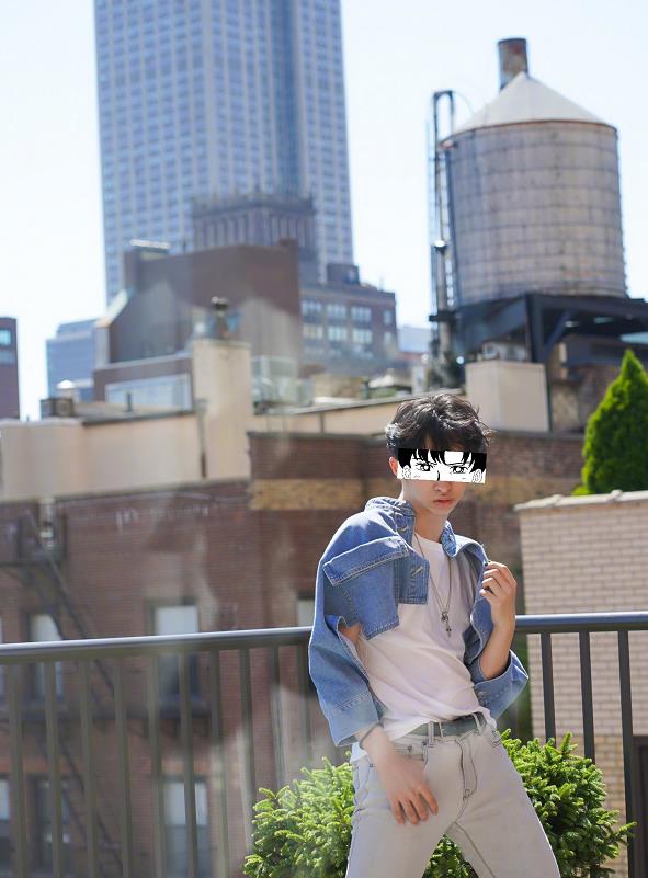 第二张是一张正脸照,很帅气,只是被伊能静给遮住了眼睛的部分,蓝色的牛仔上衣,非常的个性,搭配纯白色T恤与浅色的牛仔裤,满满的少年感,扭动着身体,单手大拇指插兜,酷劲十足。