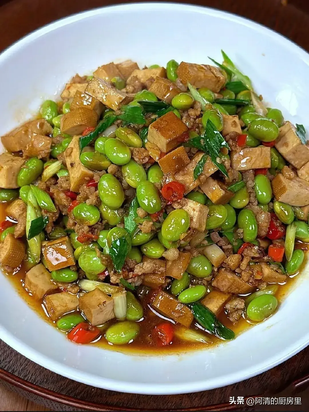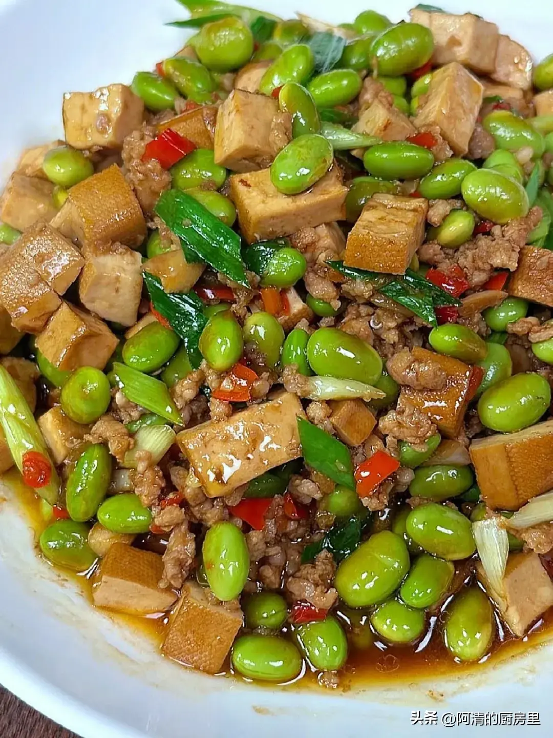 所需食材:毛豆350克、肉沫150克、香干150克、蒜苗、小米辣、蒜末