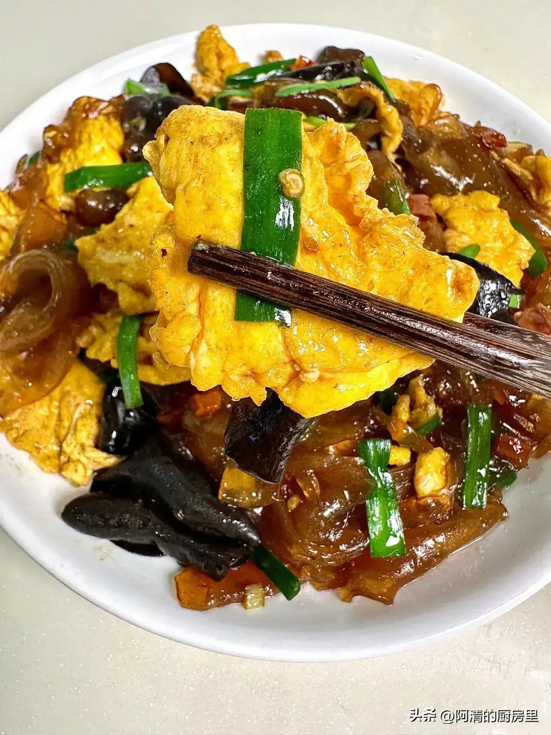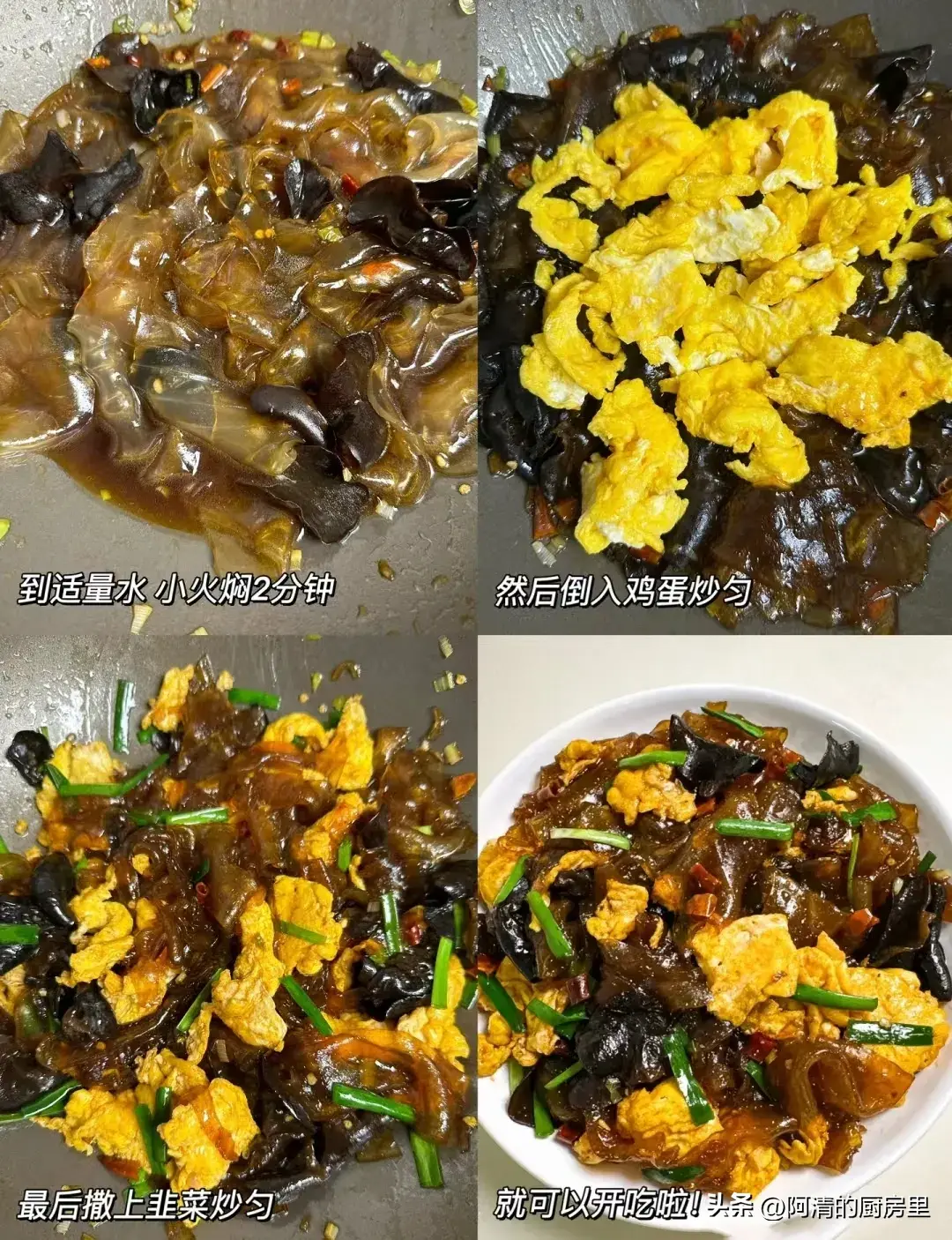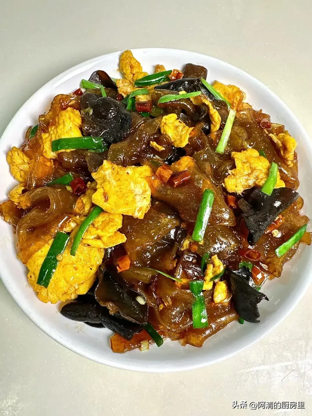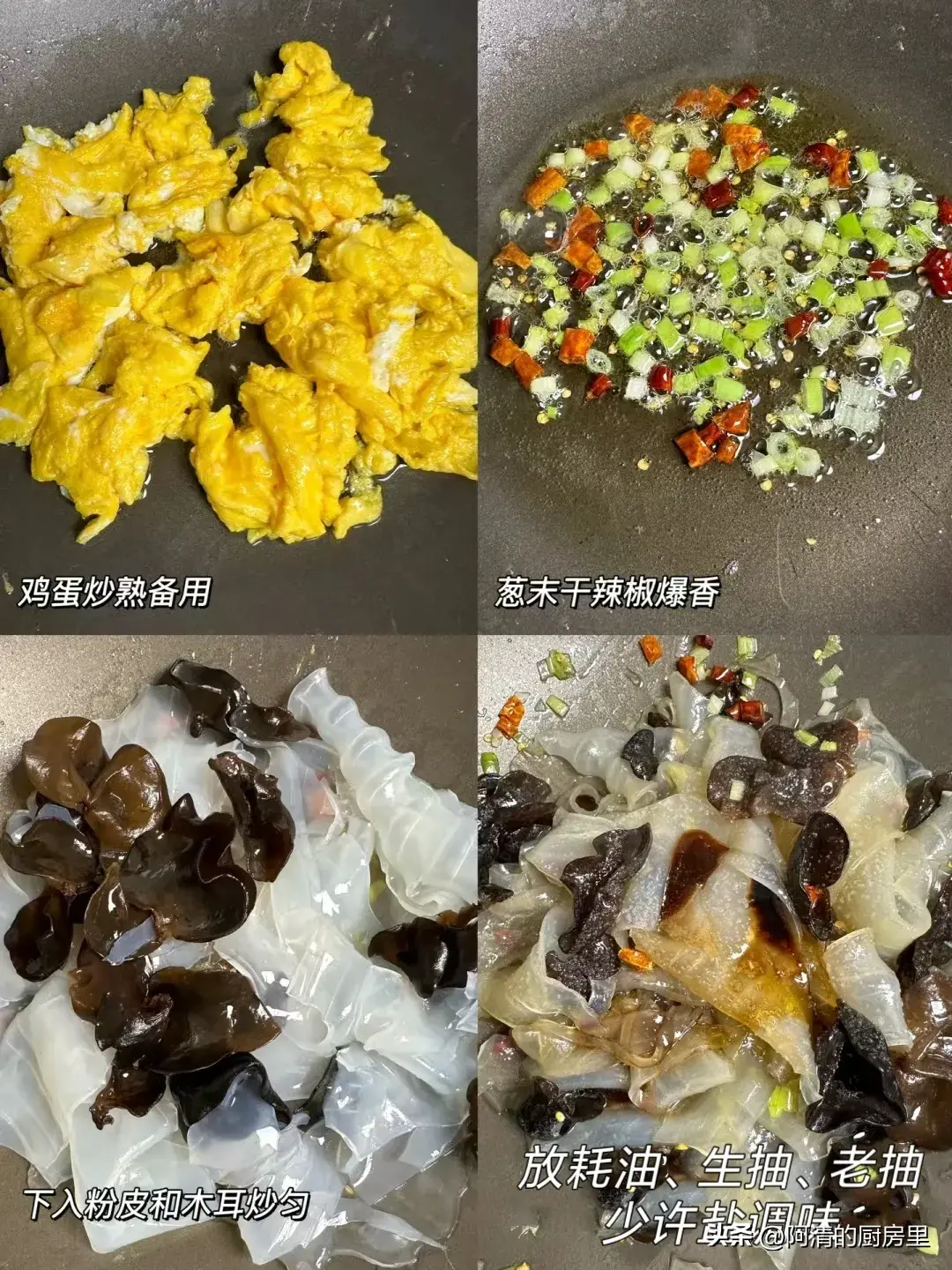 所需食材:鸡蛋、黑木耳、红薯粉皮、香葱、干辣椒