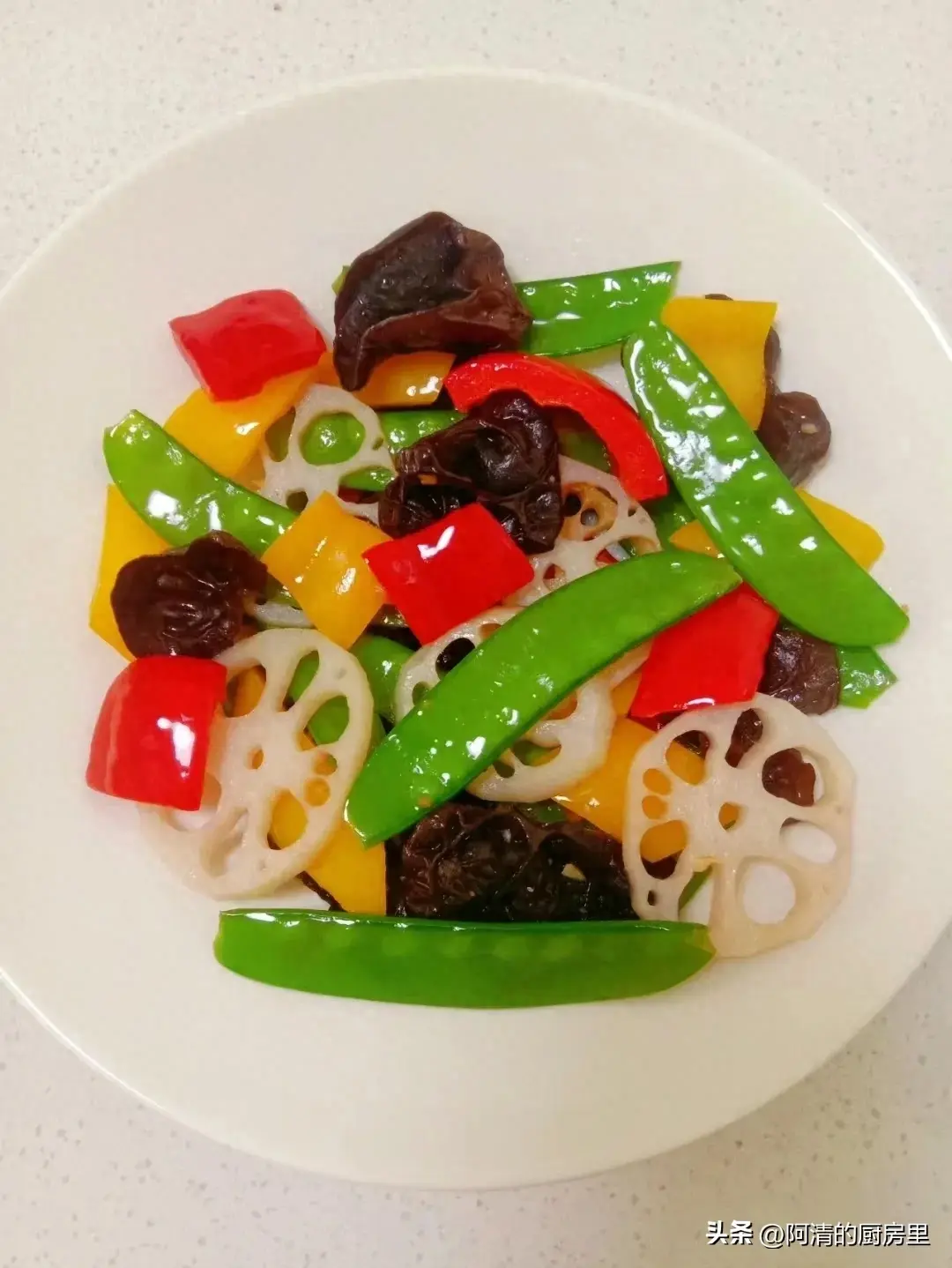 所需食材:荷兰豆、藕片、黑木耳、彩椒、蒜末