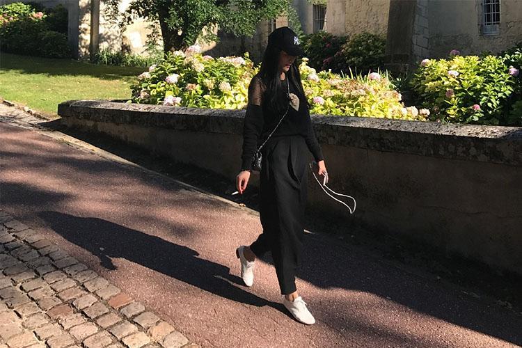 或者是一身黑色的套装尽显酷女孩本色。上身袖子做了微透设计,下身哈伦版型九分裤,既显风情又不失休闲,看着很舒服却不媚俗,看得出极具个性。