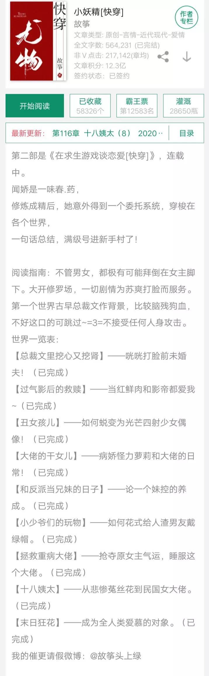 女主成精后意外得到一个系统,开始穿梭各个小世界完成委托人的委托。女主又美又飒,打脸复仇一条龙。