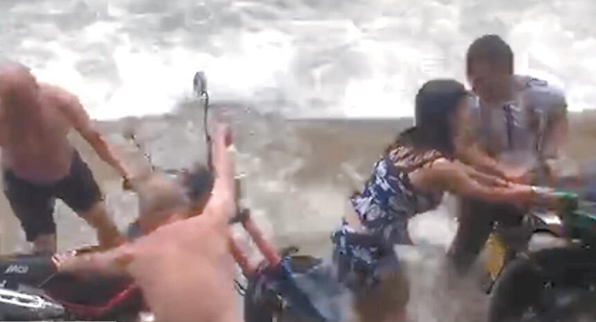7月29日,上千人涌入桂林兴安县华江瑶族乡龙塘江峡谷避暑游玩。当日下午3时左右,峡谷内只是下了一点小雨,但山洪却突然来袭,游人纷纷逃生,有人被洪水冲走。事发后,当地组织搜救,30名被困孤岛的游客获救,另有4人不幸遇难。图为山洪来后,峡谷被淹没,游客在岸边躲避。