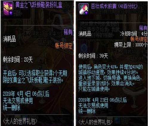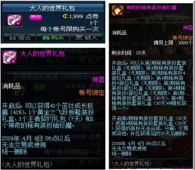 大人的世界礼包:礼包出售时间为4月1号到4月4号,礼包售价1999点卷,礼包物品包含神奇的稀有装备袖珍罐开启可随机获得第四期和第一期的稀有装扮套装,单件或者带期限的稀有装扮礼盒,单件(30天).黄金飞跃板鞋装扮礼盒开启可以获得一件鞋子部位装扮,成长胶囊可使角色变大百分之41且城镇速度增加百分之41.