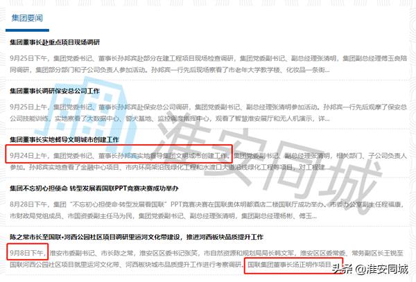 根据官网内集团要闻显示,原党委书记、董事长汤正明最后参加官方活动是9月8日参加国联·河西公园社区项目工作汇报。9月24日后,孙邦宾以集团党委书记、董事长身份陆续参加“实地督导文明城市创建工作”、“调研保安总公司工作”、“赴重点项目现场调研”等一系列活动。