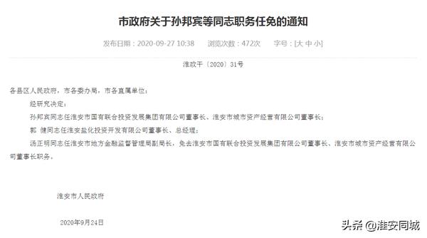 资料显示,新任淮安国联集团党委书记、董事长孙邦宾,曾任职于淮安新城投资开发有限公司党委书记、董事长。