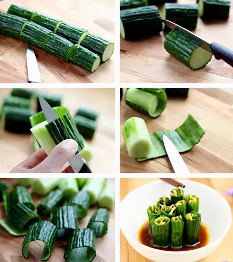1、 黄瓜切长条,去肉留皮。把黄瓜切成4.5厘米长的段,放平用刀滚批,切下带皮的厚约0.3厘米的瓜肉;