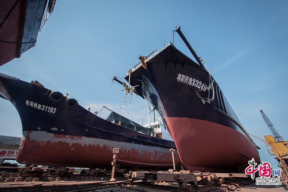 7月,正值休渔期,闸坡国家中心渔港渔民对船只进行维修保养、重新上漆、设备检查以及补网等工作。 中国网记者 伦晓璇 摄