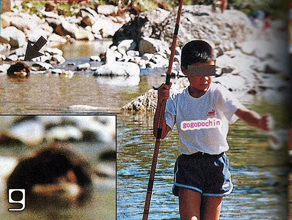 9.另一张于钓鱼时拍摄的照片,男童身后正有一个“神秘的头”浮出水面看着他。会否只是块石头?