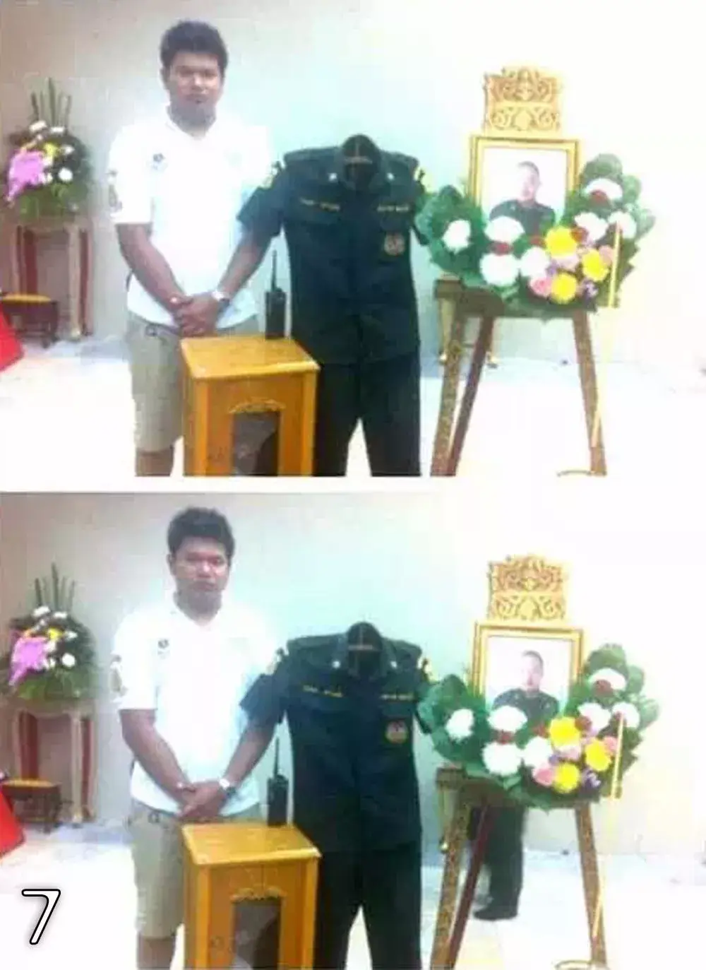 7.在泰国一场葬礼上,一个人正在与死者的制服合照,这名死者在救人时死去,当时人们没有找到他的鞋。拍第二张照片时,遗照后出现了一双神秘的腿,这双腿同样没有穿鞋子。