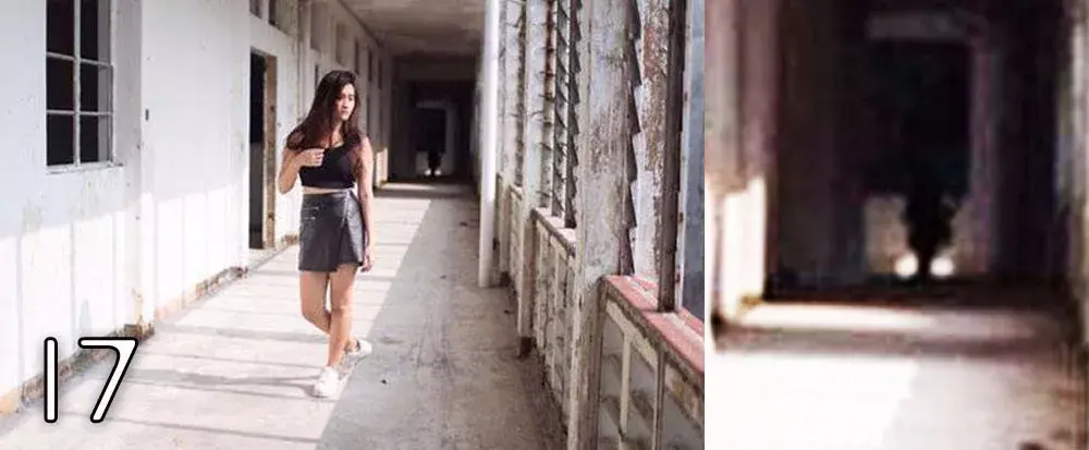 17.照片中是一名模特大白天在拍摄照片,但是在她的身后却出现了一个恐怖的黑色鬼影。拍摄地点是新加坡废弃多年的樟宜医院,是当地一个著名的猛鬼之地,很多电视台也都曾在这里录制过探灵节目。
