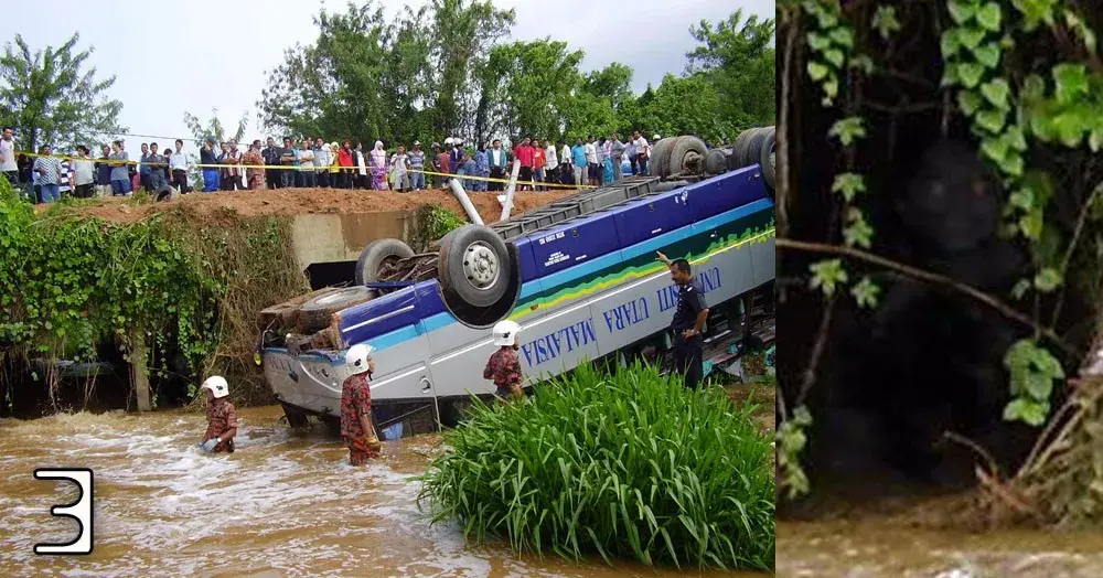 3.这宗车祸发生在2005年马来西亚吉打州,一辆超载的北方大学巴士翻倒并坠入河中,导致5人重伤47人轻伤。事件发生后,一名新闻报记者在现场进行拍摄,照片在刊登于报章及网站后惊动了社会,只见桥下的桥洞里有一只“怪物”眼睛发着光、疑似咧嘴笑着正面对着镜头。