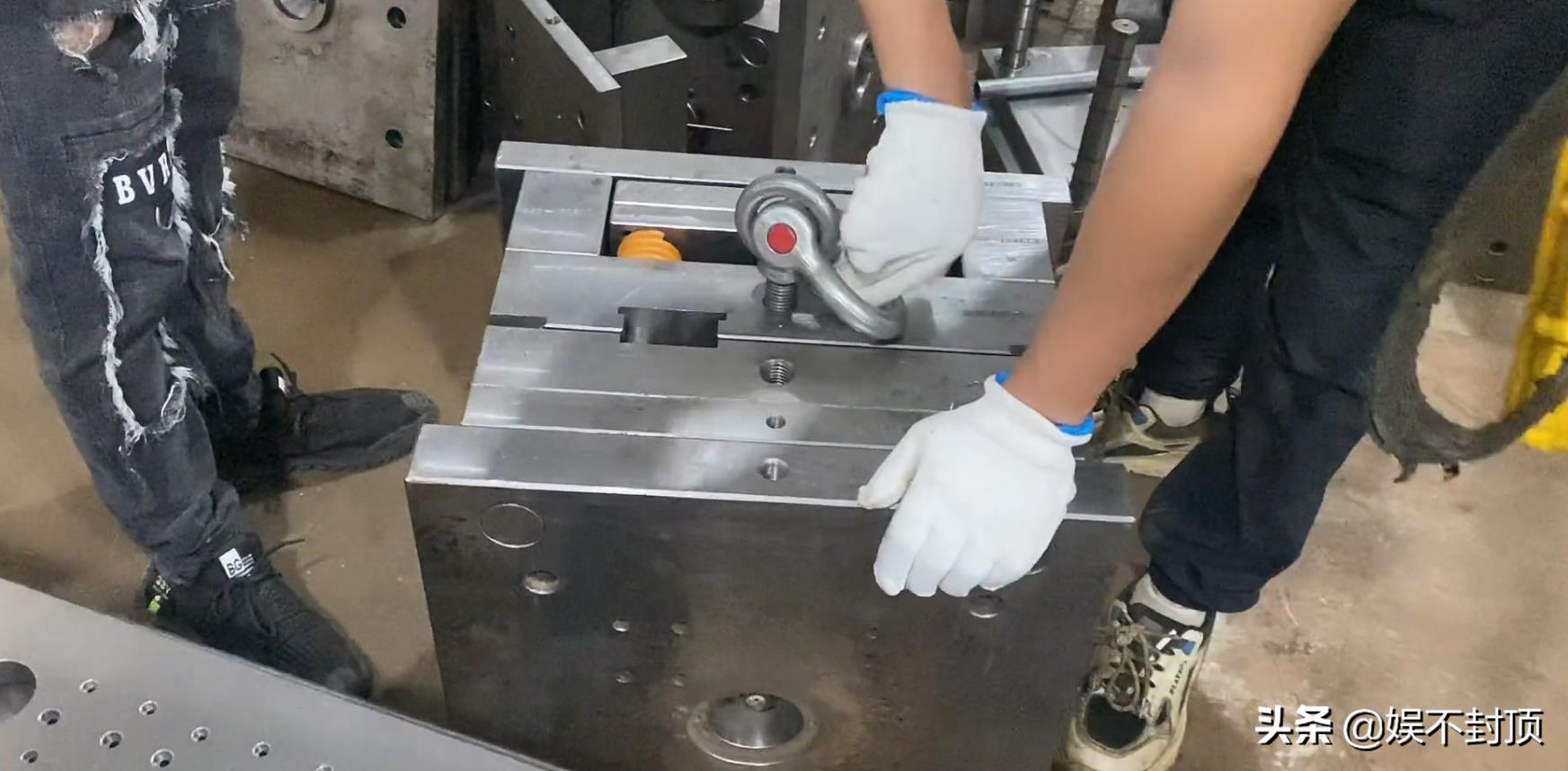 这种模具首先要用绳子把模具绑起来,再通过机器把模具吊起来才能把模具拆开,在这里特别要提醒一下大家,在调模具的时候,一定要小心一点。