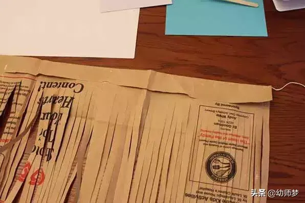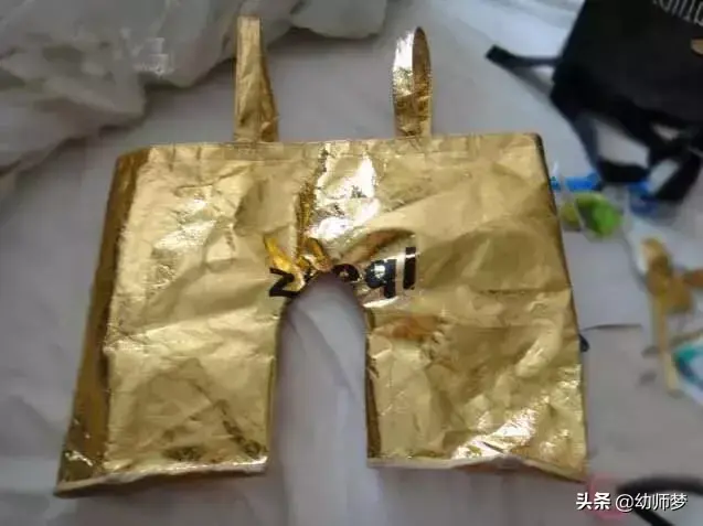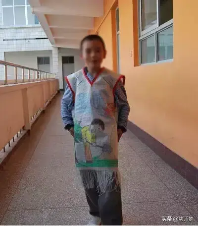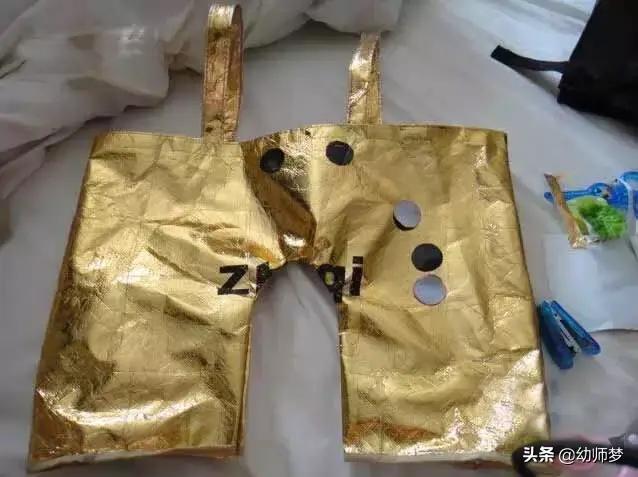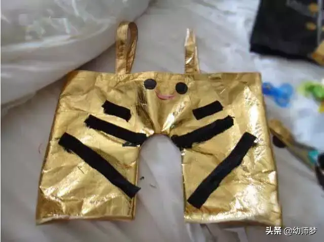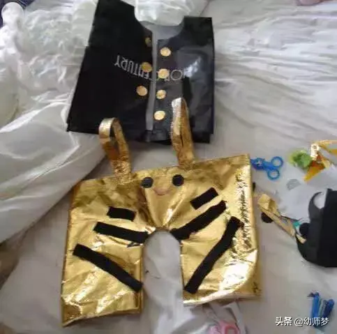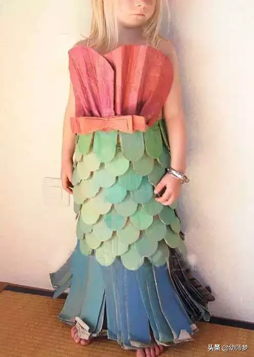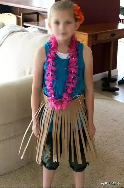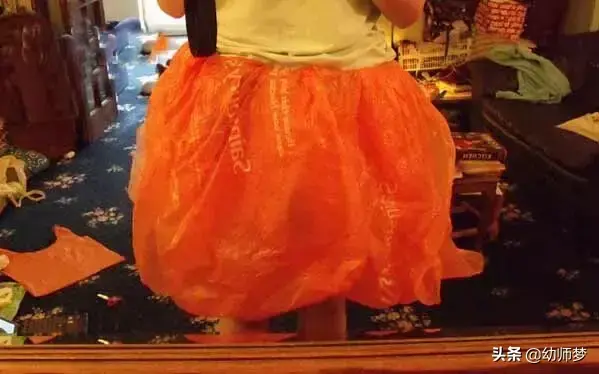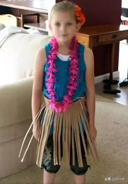 把大编织袋修剪出脖子和胳膊的洞洞,在下端剪出一条条须须,然后画上漂亮的图案,一件衣服就完成了!