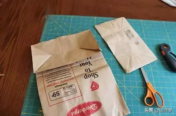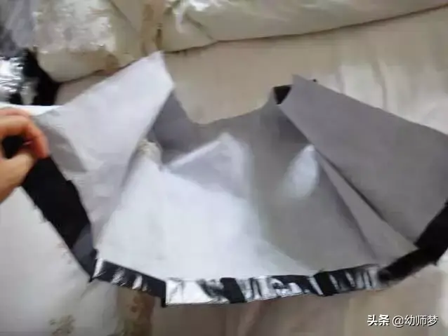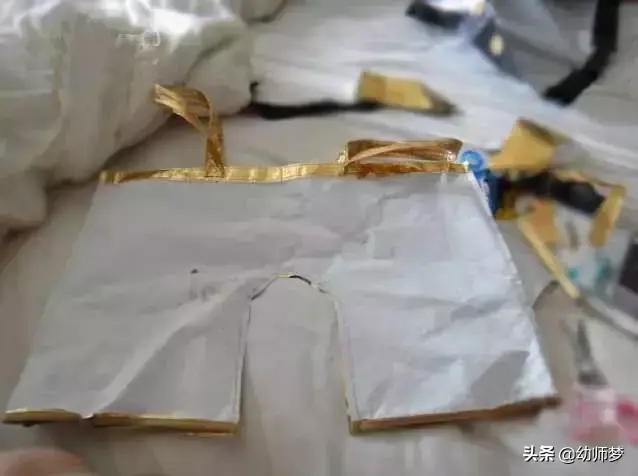 然后把底剪开,再把中间剪开做两条裤腿,这样子就做出了裤子的形状。把之前剪下来的两根手拎带子换个主向,订上去,像背带裤一样啦~
