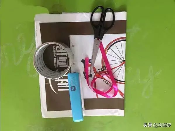 手工材料:报纸、透明胶带、剪刀、丝带、订书机