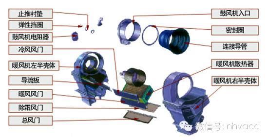将蒸发器、暖风散热器、离心式风机、操纵机构、进风罩和壳体等组装在一起,布置在车内仪表板下方。