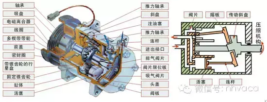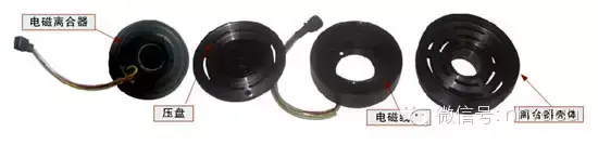 压缩机离合器根据需要通断压缩机的动力,是压缩机带轮组件的一部分,主要由压板、转子和定子组成。更换压缩机时,可将原离合器总成安装在新的压缩机上。