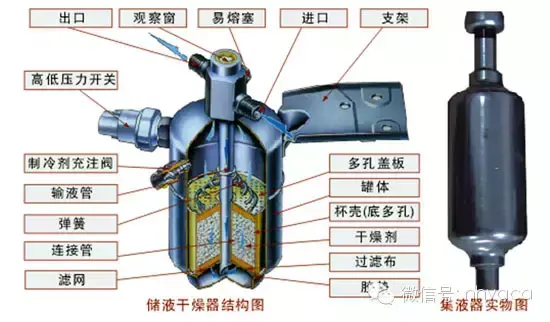 蒸发器的作用:将通过膨胀阀的低压、低温液态制冷剂膨胀蒸发为气态,吸收车厢内的热量,降低车内空气的温度。