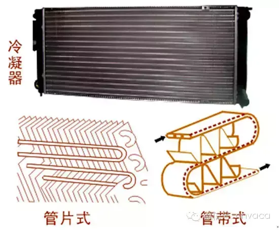 冷凝器按结构形式分为管片式、管带式和平行流式,如下图所示。管带式比管片式传热效率高,而平行流冷凝器是为适应R-134a制冷剂而研制的新型冷凝器,突破了前二者的局限性,传热效率更高。