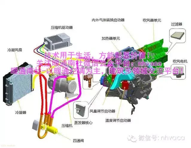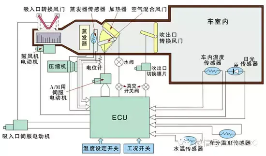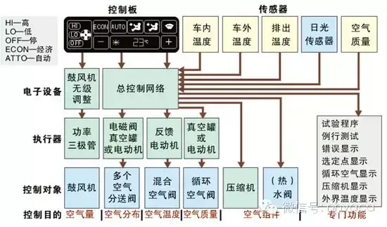 汽车空调系统按其功能可分为制冷系统、加热系统、通风与空气净化系统和控制系统等几个主要组成部分。