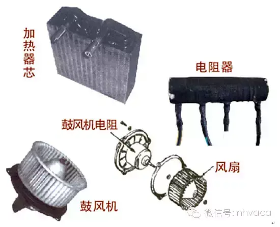 加热器和鼓风机组成一体,称为暖风机,它是空调暖风系统的最主要的零件,暖风系统提供热量就是在这里产生。