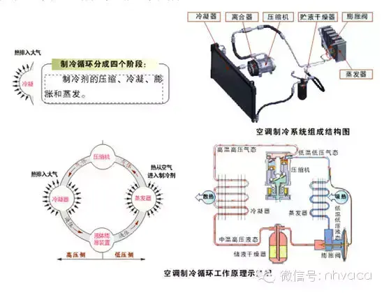 所有汽车制冷系统一般由压缩机、冷凝器、贮液干燥器(集液器)、节流装置(膨胀阀或膨胀管)和蒸发器等部件组成的 ,其工作原理如下图所示。