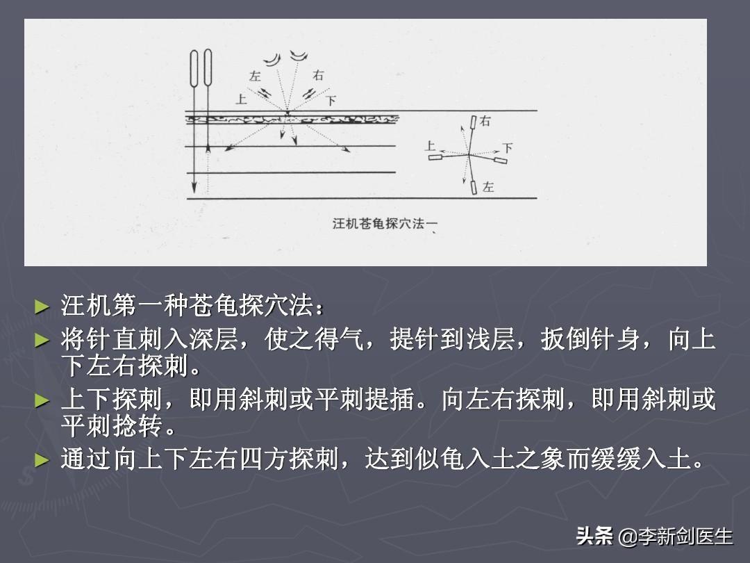 苍龟探穴是飞经走气四法之一,首载于《金针赋》,日“苍龟探穴,如入土之象,一退三进,钻剔四方。”是指进针得气后如龟入土般慢慢而进,先退出皮下,再从东西南北四个方向由天地人三部缓慢而进。
