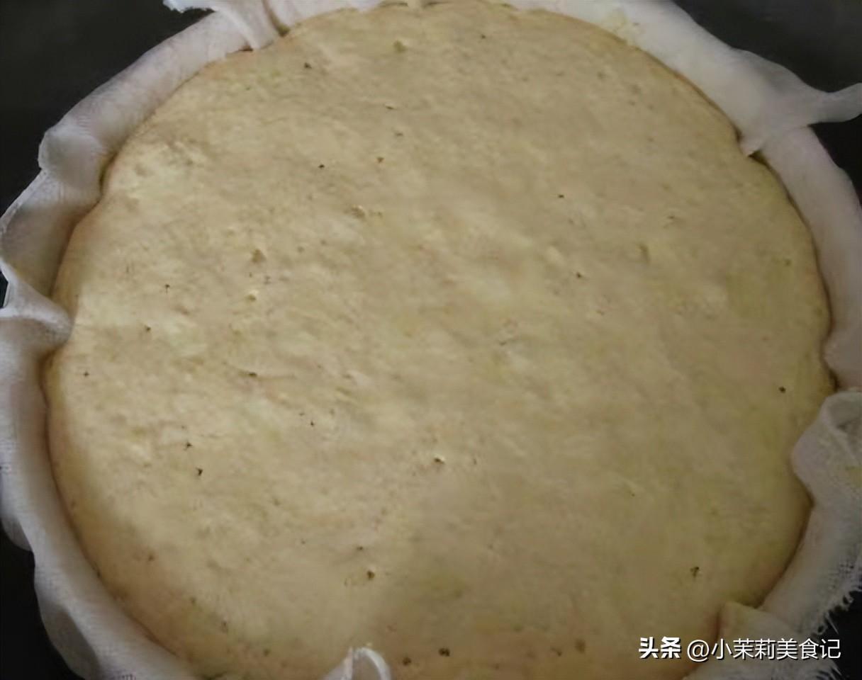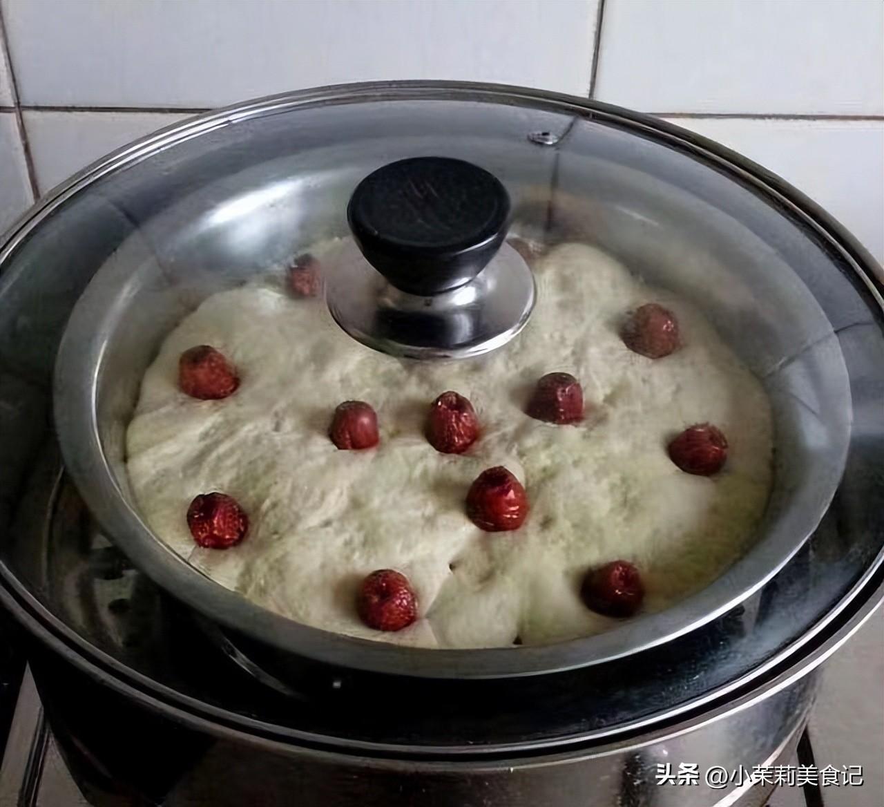 3、把湿面团放到蒸屉上,底部加一些热水,使面团充分发酵,出现密集的气泡。