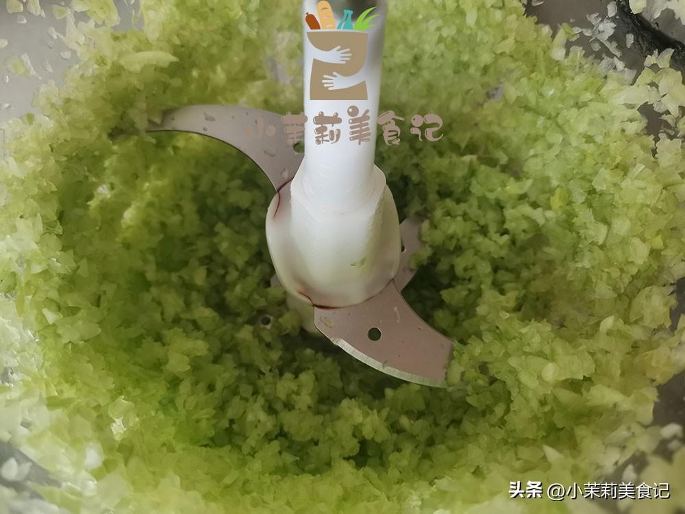 3、芹菜摘掉老叶,撕掉老筋,掰成小段后,放到绞馅机里边搅碎,当然不要绞成碎沫,那就没有口感了。