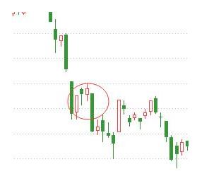 市场处于下降趋势,一根长阴线的出现使其跌势得到加强。随后三天则为实体短小的线形,其走势与既定趋势相反。如果这些盘整线形的实体为红色,则情况最佳。必须注意,这些短小的实体全部位于第一根长黑线的高、低价范围内。最后一天开盘价应该在前一天的收盘价附近,收盘则创出新低,宣告市场休息时间结束。