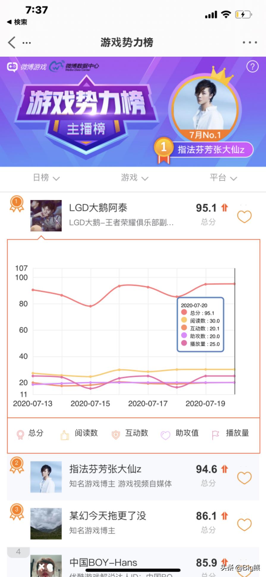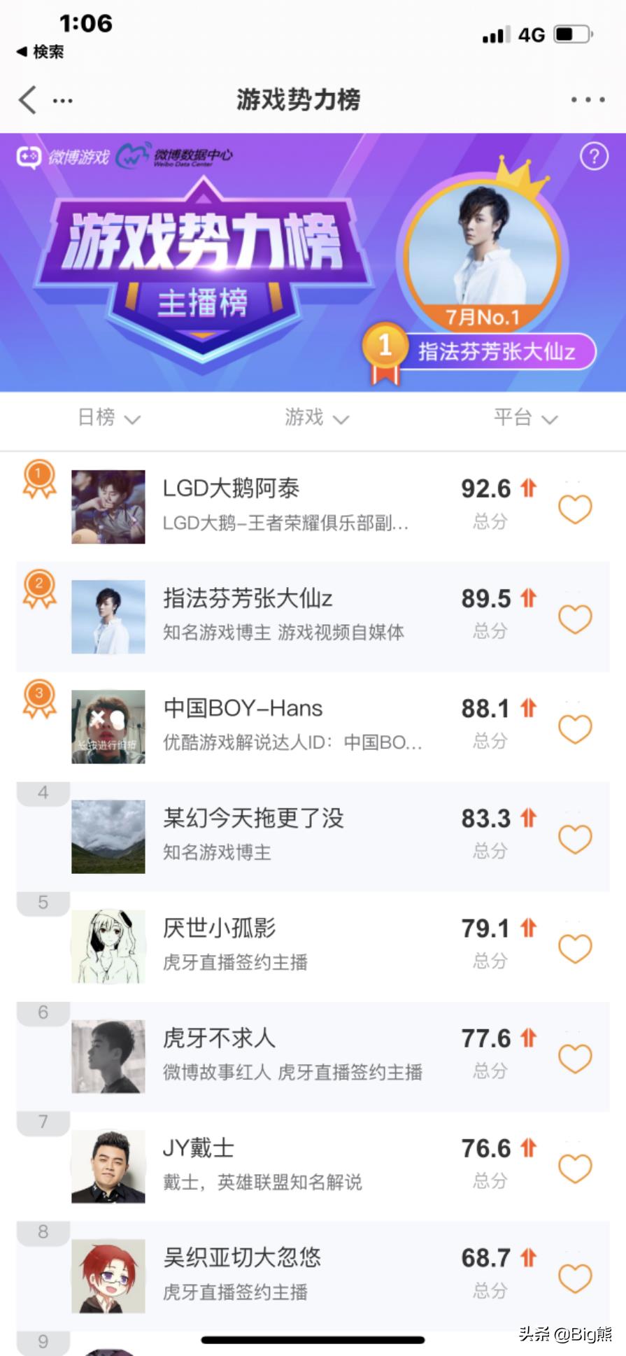 阿泰登顶微博游戏势力榜第一名,力压张大仙持续霸榜