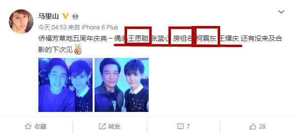 不过刚刚小编又在马里山的微博发现他晒了与房祖名的合照,并发文“侨福芳草地五周年庆典~偶遇王思聪 张蓝心 房祖名 柯震东 王耀庆 还有没来及合影的下次见”。没错,你没看错,柯震东也在,看来房祖名与柯震东的关系确实铁啊!