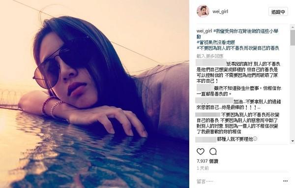 黄薇渟4月30日在Instagram上发文,晒出一张戴着墨镜的自拍照,却同时配上充满感叹的文字,心情似乎有些不好,「#我蛮受够你在背后做的这些小举动#当初果然没看走眼#不要因为别人的不善良而改变自己的善良」。