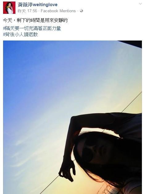此外,黄薇渟同步也在脸书晒出类似自拍,直接讲明希望背后的「小人」退散,「今天,剩下的时间是用来安静的」,同时也不忘对自己喊话,「隔天要一切充满着正面力量」。