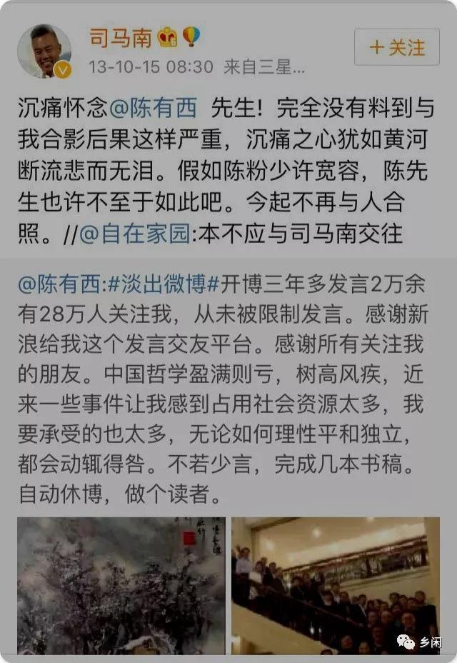 这张合影,正是与司马南老师合影,在2013年风头正劲的微博宇宙,掀起巨浪。正是这股浪头,这张与司马南老师的合影,迫使陈有西隐退微博,至今已经过去八年。