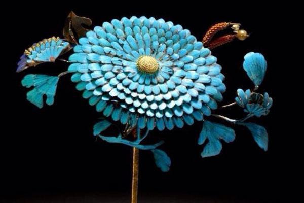 翠鸟毛光泽好颜色鲜亮,再配上金光闪闪的凸边,衬托古代仕女乌黑如云的绣发,犹如幽幽湖水上点点灵动的浮光魅影。然而翠鸟娇小,羽毛柔细,即使制一朵精巧的头花却要牺牲许多美妙的小生灵,因此后世出现了多种仿点翠的饰品。