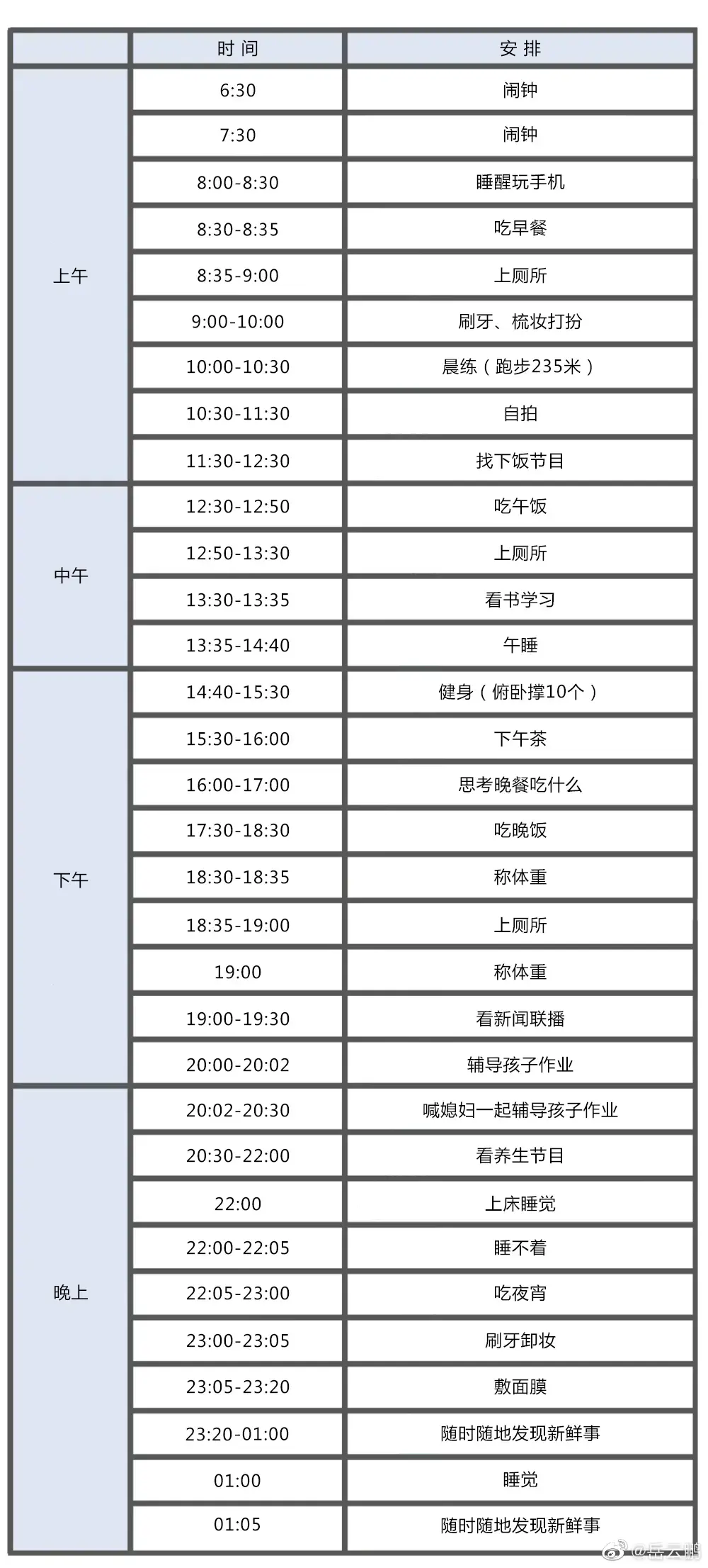 小岳岳这个作息时间表也是个段子:比如早餐5分钟,去厕所25分钟,这早餐吃了多少这是?难不成在厕所里玩手机了?锻炼身体时,半小时跑步235米,有整有零真细致啊!确定没少个零吗小岳岳?健身50分钟做了10个俯卧撑,就是拉单杠也用不了那么久吧?这就是小岳岳吃这些菜长这么多肉肉的原因吗?哈哈!对了对了,午餐下饭节目会是什么哪?是看自己演出的相声节目吗?哦,还有还有,辅导孩子作业5分钟后喊媳妇儿一起辅导,是不是要混合双打了……