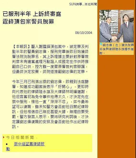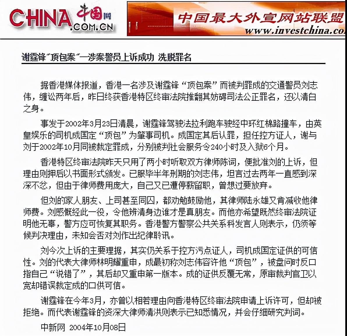 时间线也就是2002年3月23日凌晨,车祸发生。2002年10月,终审。妨碍司法公正,判240小时社会服务。2004年10月,警员刘志伟洗刷冤屈(贿赂罪名不成立)。几点时间久远流传洗脑包的澄清点 :