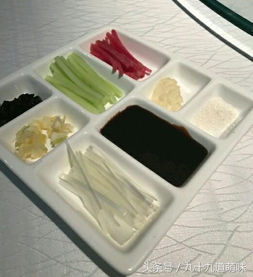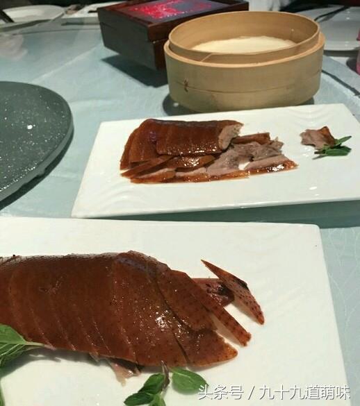 首先上来的是烤鸭,298元一只,烤鸭的味道绝对的五星,这道北京烤鸭做出了地道的北京味挺难得的,个人感觉比吃过的全聚德还好吃,可能保留了鸭油的香味,感觉很香。这道菜也是这里基本上必点的一道了,分量也足的,而且上菜速度也很快,师傅拿着被烤的油光发亮的鸭子熟练的切了切来。每个人会给一碟配菜,有黄瓜、哈密瓜、蒜、京葱和各种蘸酱,不过这个是收费的12元每位。点烤鸭会送面皮和空心烧饼,面皮比较轻薄,一份大概十张,好像还能免费加,空心烧饼也很香。