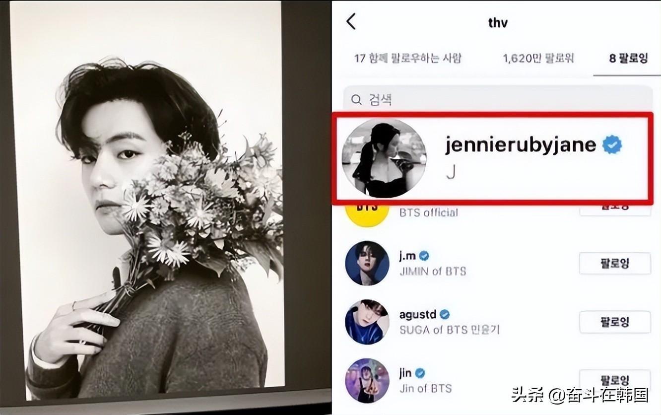 去年12月,包括金泰亨在内的防弹少年团成员们开通了个人Ins账号。当时就有网友指出成员们大都只关注了组合官方账号以及队友的账号,而金泰亨除此之外还关注了JENNIE的账号。